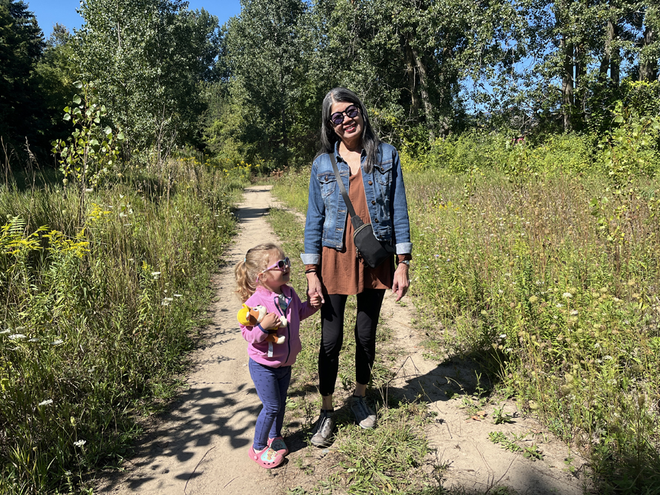 She enjoys walks in the woods near our house and we try and get her out and into them several times during the summer. This year, we took her down to watch the salmon run so she gets to learn about the local wildlife while developing an appreciation for nature. At least I like to think she is. I did get her to help me weed the garden this summer 🙂