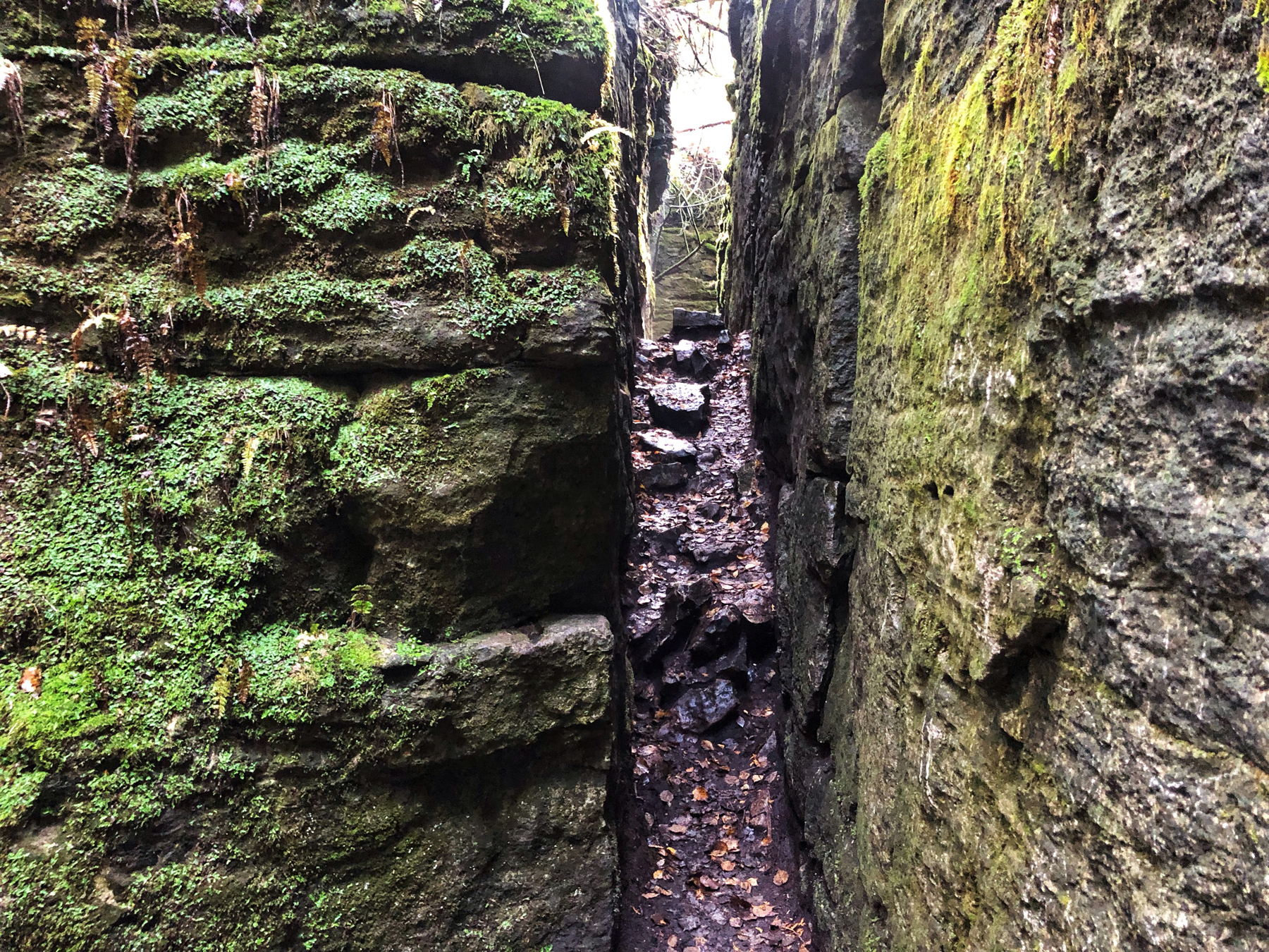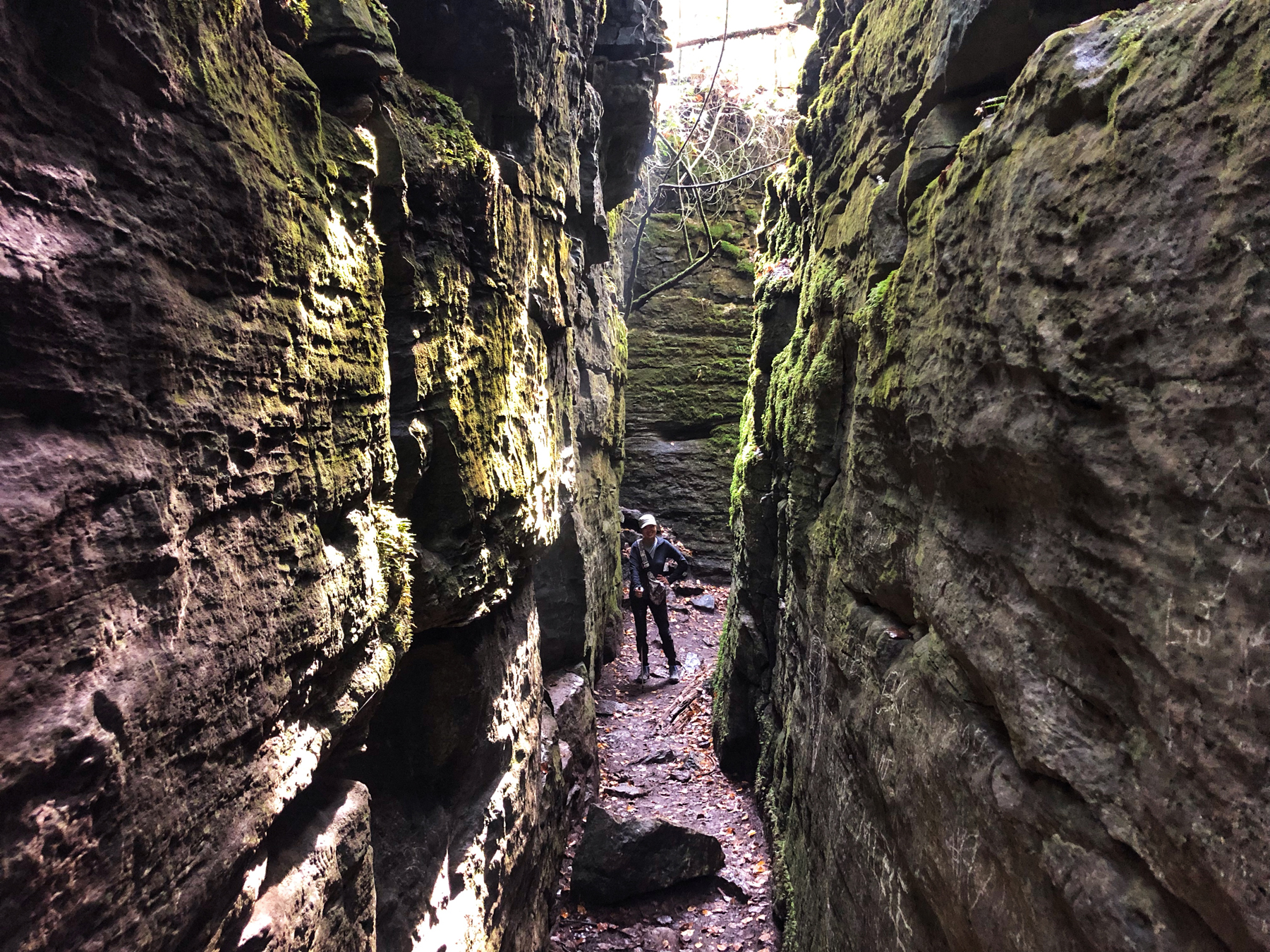 Keep a lookout for the blue blaze, as the trail takes a few unexpected turns including a tight passageway through the limestone wall, which is the namesake for the side trail. We love the thick moss carpeted sheer wall faces of the escarpment inside these crevices, so take the time to appreciate just how beautiful this hike is.