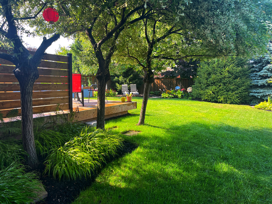I planted a new Hakone Grass shade garden this year by the side of the back deck. As our variegated Japanese Willows grow, the grass underneath them was looking increasingly sparse each year so the shade garden was the perfect solution.